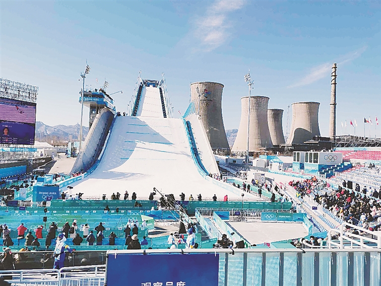 首钢滑雪大跳台又名“雪飞天”,是冬奥历史上第一座与工业遗产再利用直接结合的竞赛场馆,在设计中融入了敦煌壁画中的“飞天”元素。“雪飞天”比电视里看上去坡度更陡,亲眼看着选手们从坡顶飞驰而下,在半空中炫技,着实刺激。