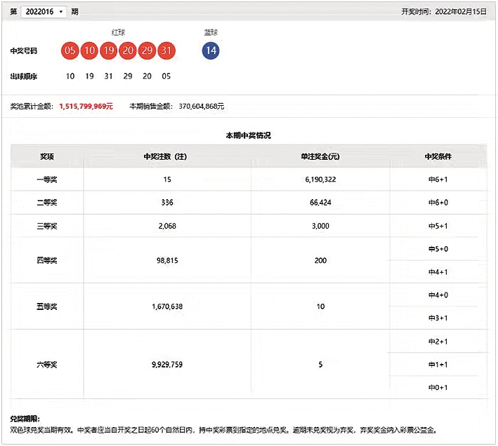 15日晚,中国福利彩票双色球游戏进行第2022016期开奖。当期双色球红球号码为05、10、19、20、29、31,蓝球号码为14。