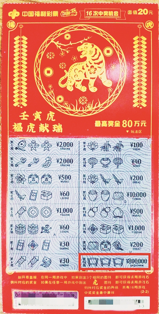 目前,生肖票“壬寅虎”亿元派奖活动仍在火爆进行中。本次派奖活动对“壬寅虎20元”和“壬寅虎50元”两款游戏的100万元、100元和60元三个奖级进行派奖,单张兑取100万元的彩票中奖者,派送100万元固定奖金;单张兑取100元的彩票中奖者,派送50元固定奖金;单张兑取60元的彩票中奖者,派送30元固定奖金。虎年刮虎票,虎年行大运!让我们一起感受福彩刮刮乐“壬寅虎”生肖票带来的惊喜与欢乐吧!