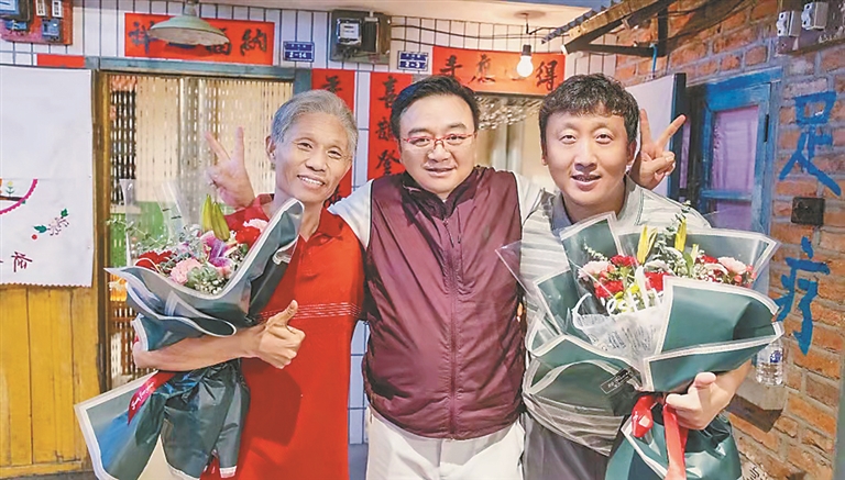 熊大爷扮演者李学政和导演李路、儿子扮演者李思博