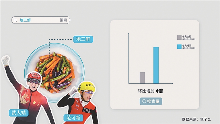 中国代表团夺得冬奥会首枚金牌后,东北籍运动员家乡菜“地三鲜”搜索量也增加了4倍。冬奥会“魔性解说”频上热搜的王濛,最爱吃的酸菜排骨搜索量也翻了2倍。