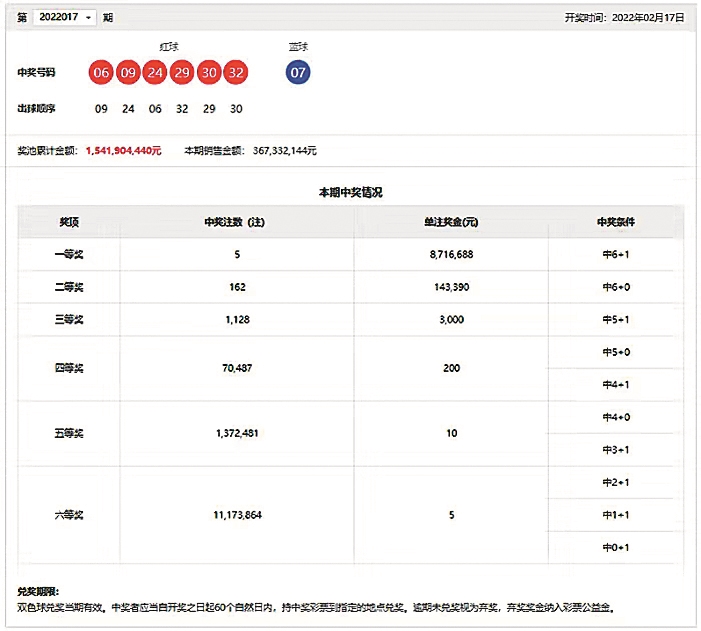 据中彩网报道 17日晚,中国福利彩票双色球游戏进行第2022017期开奖。当期双色球红球号码为06、09、24、29、30、32,蓝球号码为07。