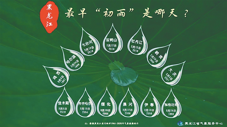 根据黑龙江省近六十年历史资料统计的十三地市历年初次降雨日期来看,南部大部地区的平均“初雨”日期都出现在3月中旬至4月中旬,北部大部地区平均“初雨”日期则要在3月下旬至4月下旬期间才有首次降雨出现,除少数地市外,各地的最早“初雨”日期也均在2月下旬至3月,可见,黑龙江“初雨”时间明显晚于雨水节气。