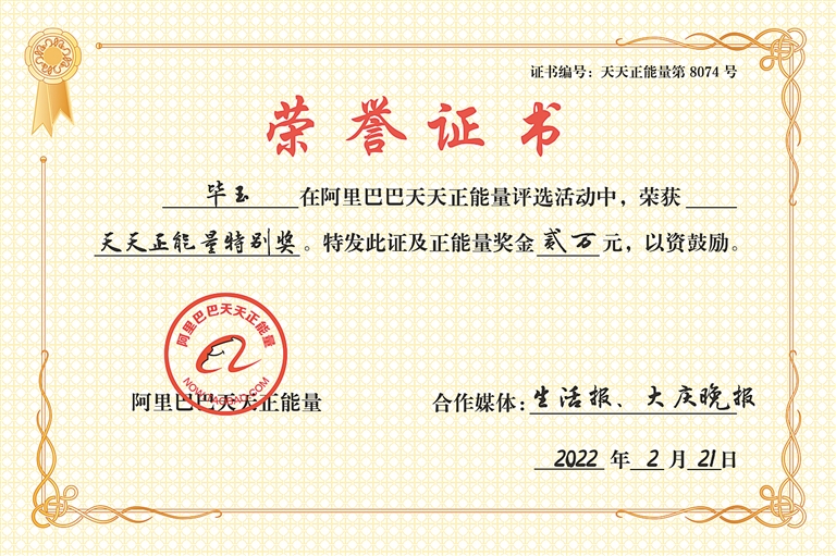 近日,生活报记者采访了王卫康的母亲,毕玉多年来含辛茹苦,将两个孩子抚养长大。为了表彰毕玉一家,弘扬正能量,阿里天天正能量联合本报、大庆晚报为其颁发正能量特别奖,奖励两万元正能量奖金。