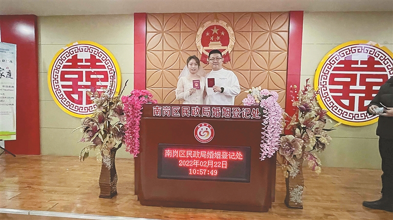 生活报讯 (记者于海霞文/摄) “2022.02.22”是一个特别的日子,当天不仅是周二,还是农历正月二十二,因为 “2”谐音 “爱”,被网友称为“最有爱的一天”。为讨个好彩头,哈市不少新人当天排队办理婚姻登记。生活报记者22日从哈市民政部门获悉,当天,哈市迎来今年第一个婚姻登记高峰日,全市共为新人办理结婚登记1505对,是正常工作量的6倍之多。