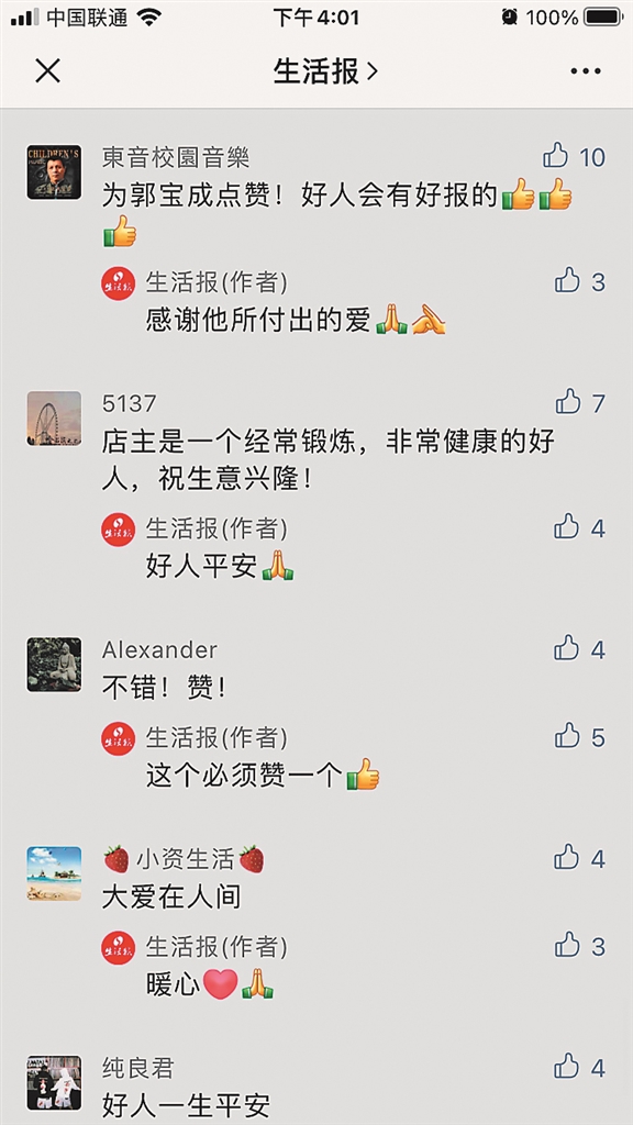 郭宝成同时也通过本报呼吁:“不光是环卫工人,出租车司机或者公交车司机,只要是有需要的人,来我们店里歇歇脚、喝点儿热水,我都欢迎。同时也希望有越来越多的同行能奉献自己的爱心。”郭宝成通过自己的爱心举动,感染了身边的人,也让有需要的人感受到了关爱,就像生活报网友的留言一样:“大爱在人间!为郭宝成点赞!”
