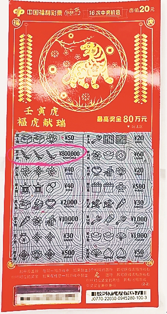 刘先生购彩多年,会不定期到福彩销售站买上几张刮刮乐。2月16日,刘先生下了班像往常一样来到平湖市乍浦天妃路158号33065422福彩销售站,共买了五张刮刮乐,当场刮了起来,没想到其中一张“壬寅虎”刮到第二行,竟出现相同图符,后面显示的奖金是“800000”。刘先生表示,以前自己也中过几百元的奖,没想到能收获这么大的奖,太惊喜了。