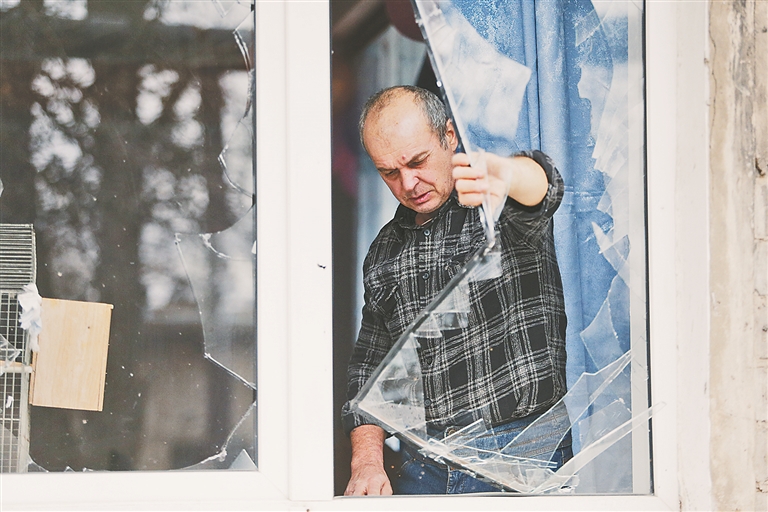 24日顿涅茨克当地居民查看受损的房屋 新华社发
