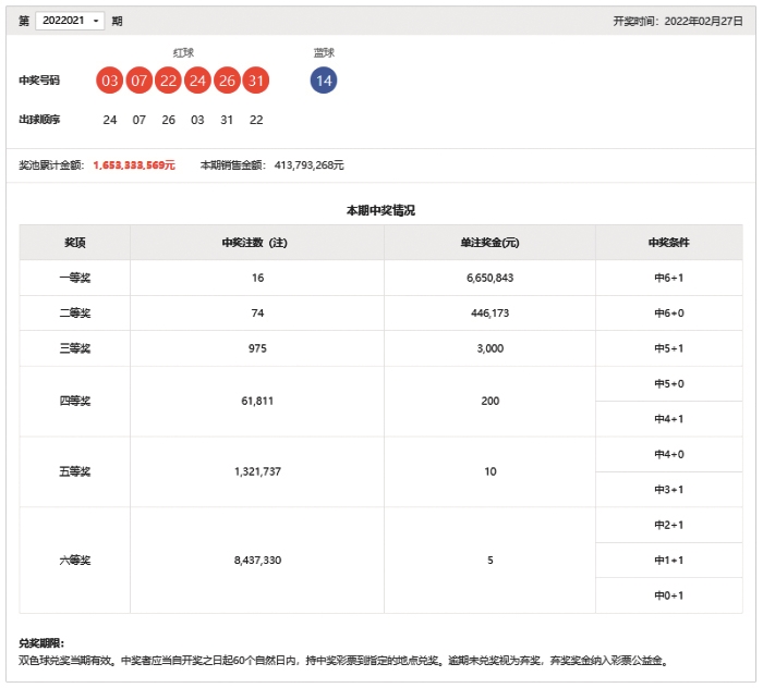 2月27日晚,中国福利彩票双色球游戏进行第2022021期开奖。当期双色球红球号码为03、07、22、24、26、31,蓝球号码为14。