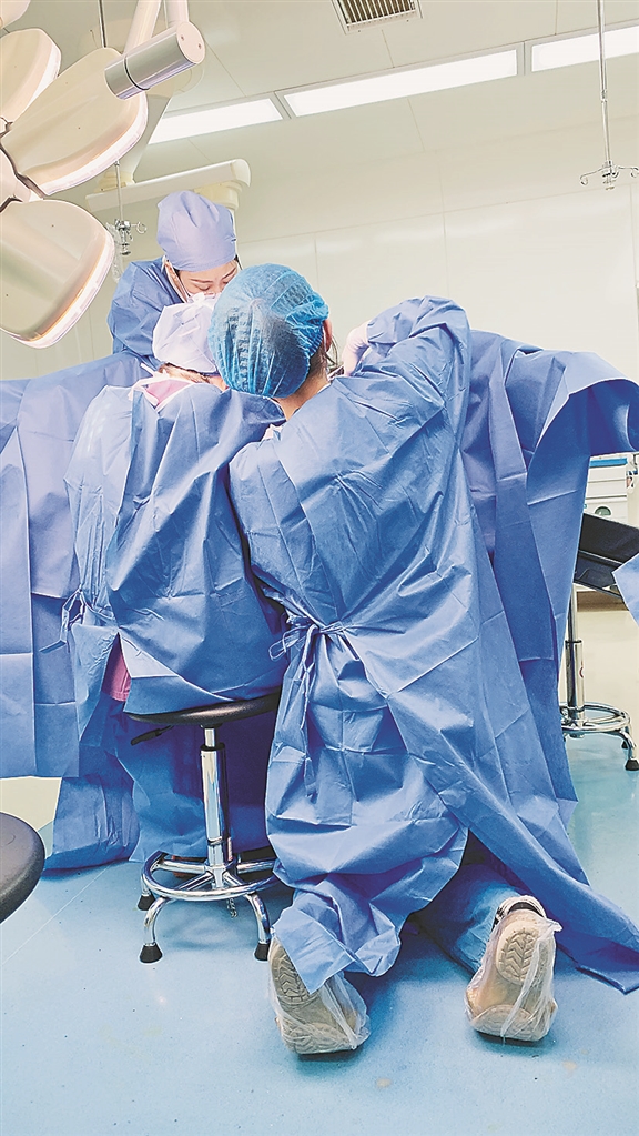 蔡雁主任和主治医师曹野仅仅为缝出更有效的一针,多次尝试切换各种不同姿势。为了更好的进行手术,“大白们”只能双膝跪在地板上,经历了举步维艰的一小时,手术成功了,开放的宫口被束口袋一样“扎”了起来,宝宝被留住了。