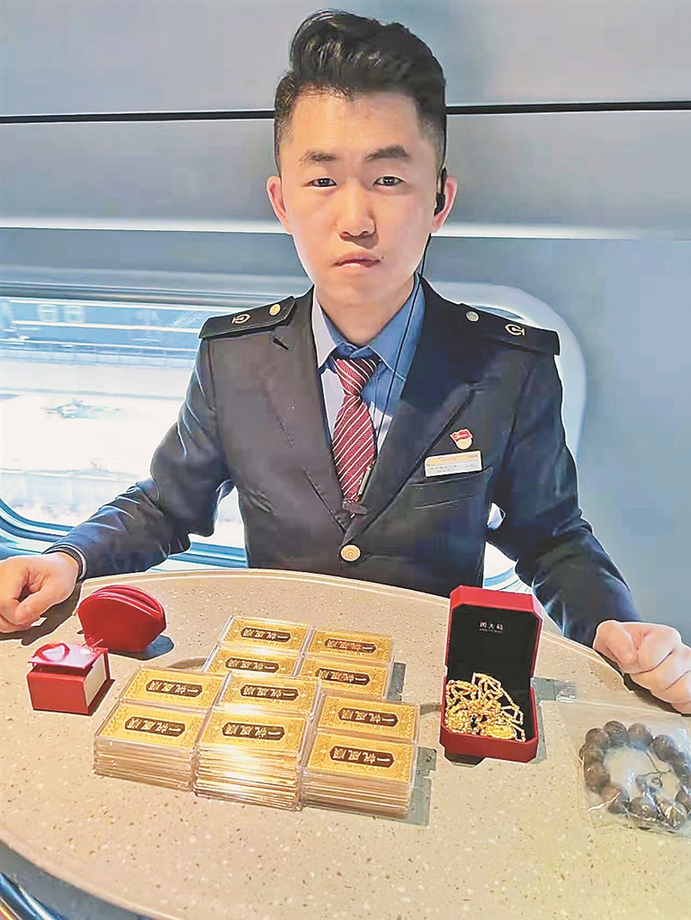 2月26日,在天津西开往哈尔滨西的D27次列车上,马超在巡视时,发现8车行李架上有旅客遗失黑色皮质双肩包一个。随后,马超与乘警核验包内物品时,现场人员都大吃一惊:包内竟装着52根刻有“一帆风顺”字样的金条,此外,还有金项链两条、手串1个,车钥匙1把,生活用品若干。
