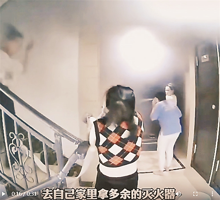 近日,生活报记者采访了张丹丹。据介绍,2月26日深夜11时许,张丹丹正在家,“周末嘛,我就想着迟一点儿睡没关系。敷了个面膜在厨房里搞卫生。”突然,门外传来了呼喊声:“着火了!”张丹丹顺手从家门边拿了一个灭火器,开了门发现,是对门起火。