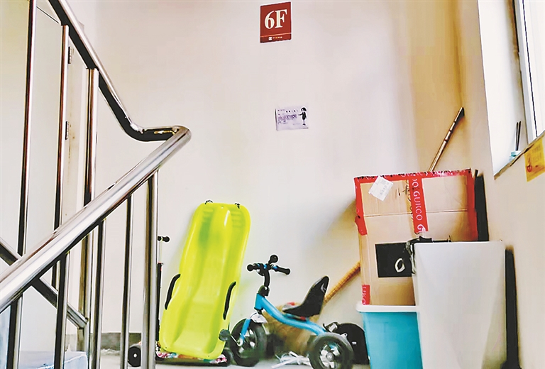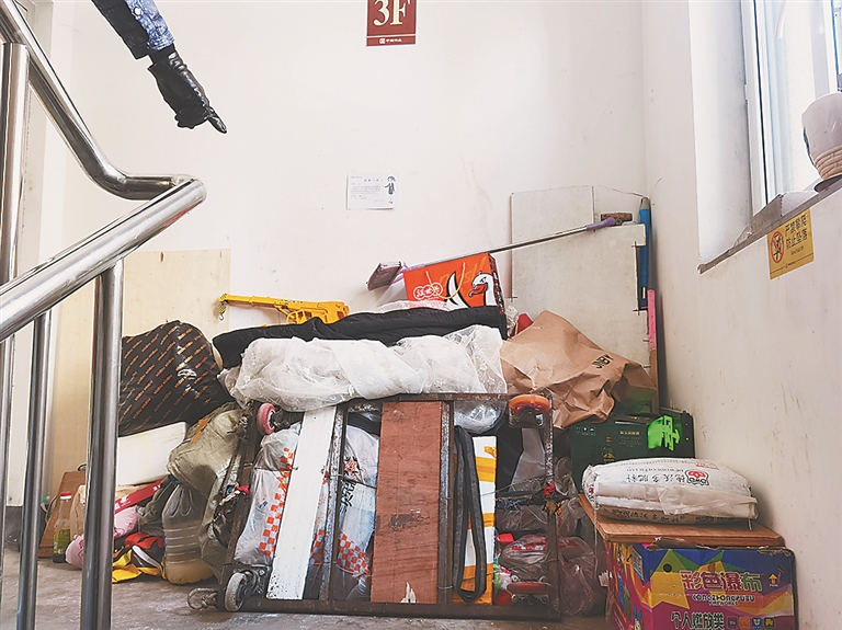 小区居民说,这种乱堆杂物的情况已有近两年了。一家堆放没及时清理,其他家就效仿,往楼道里堆放杂物的人家也就多了起来。