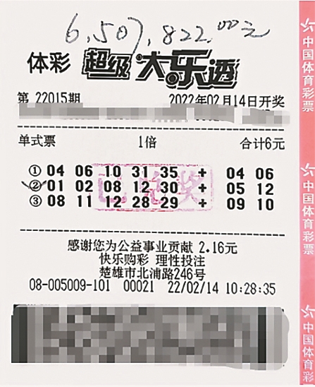 生活报讯 (许褚) 日前,云南楚雄的一位幸运儿反反复复确认了十多遍,才相信自己真的中了大乐透大奖650万元!