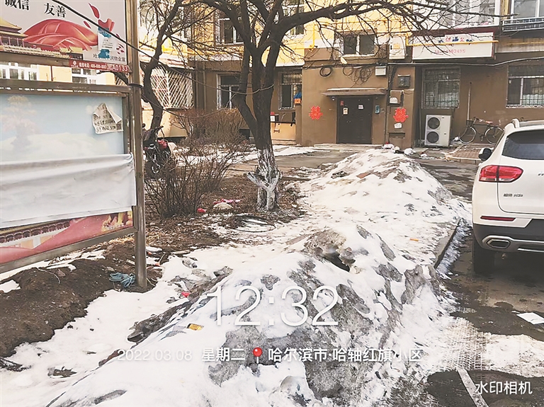 生活报讯 (记者黄迎峰文/摄) 8日,家住哈尔滨市香坊区哈轴红旗小区的王先生向生活报反映,小区不仅存有雪堆、冰包,还有一些散乱的垃圾,影响小区环境,多次和中润物业沟通至今没有得到有效处理。对此,生活报记者进行了走访。