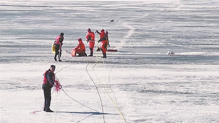 据目击者王先生介绍,事发地点在报业大厦附近冰面,当时10多名消防救援人员在现场营救,坠江男子距离岸边约200米。