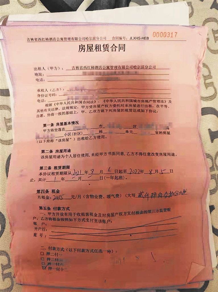 和王女士一样,魏女士也将房屋授权给“西红柿公司”出租,租赁合同显示,租期为24个月,自2021年5月31日至2023年5月20日。“我的房子在松北国际城,我当时把房子挂在网上,‘西红柿公司’主动联系我,我把房子租给他们,1600元/月,9月就找不到他们人了。现在租户把一年的房租交给了‘西红柿公司’,我也不可能给人家撵出去。”魏女士表示,自己目前只收到了2个月的租金和1个月的押金。