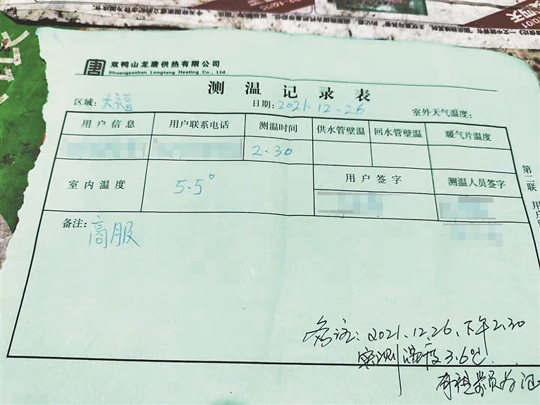 据了解,集贤县大福公寓共有12家门市商铺,张先生2012年在此处租了一间门市房,经营农资商店。“每年冬天室温都不高,特别冷。”张先生说,今年温度比往年更低,为了正常营业并居住,他只能使用电暖气、“小太阳”取暖,并多次将室温不达标的情况反映给负责供热的双鸭山龙唐供热有限公司。后来,供热公司的工作人员上门给张先生家测温。记者在张先生提供的一张印有“双鸭山龙唐供热有限公司”字样的测温单上看到,测温时间为2021年12月26日14时30分,温度为5.5℃。