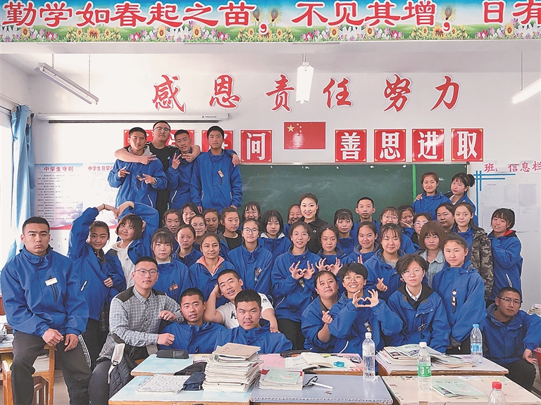 洗漱完毕,梳上马尾辫,化了一个美美的淡妆,穿上白色休闲衣、黑色运动裤,邵秋楠出发了。与学生们初次见面当日,邵秋楠起了个大早,站在三尺讲台,邵秋楠青春活力,郑重其事地在黑板上写下“邵秋楠”三个大字,让学生们念出来。别扭了半天,大多数孩子认识“秋”字,极少认识“秋楠”二字,“没有想到,已经高一,全班没有一个学生能叫出我的名字,他们的语文基础有些薄弱。”也许是青春无畏,邵秋楠满怀期待地告诉孩子们,“没关系,我们有时间,可以重头来。”从此,在清晨的早课上,常常能看到邵秋楠抱着一摞卷子或者字帖匆忙跑进教室,重重地放在讲桌前,顺手拿起教鞭,开始领着学生们大声阅读“a……o……e……”
