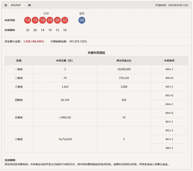 当期全国销量为4.07亿多元。计奖后,双色球奖池金额为18.50亿多元。下期,购彩者有机会2元中得1000万。转自中彩网