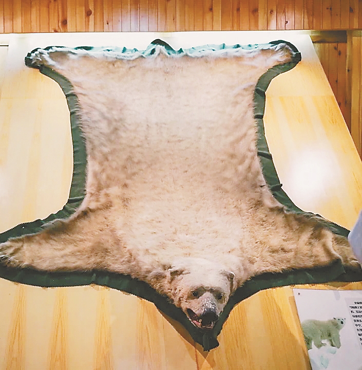 东北林业大学毛皮标本的老大——北极熊皮,曾被国营土畜产公司收藏,1997年经哈尔滨毛皮厂转至东北林业大学,是极具历史年代感的毛皮。该标本高2.77米、宽2.47米。北极熊是北极地区最大的食肉动物,也是当今陆地上最大的猛兽之一。其全身披着厚厚的白毛,仅鼻头一点黑,毛内中空的结构是它保温隔热的关键。它穿着厚厚的“羽绒服”,在浮冰上可以轻松自如地行走,完全不必担心北极的严寒。