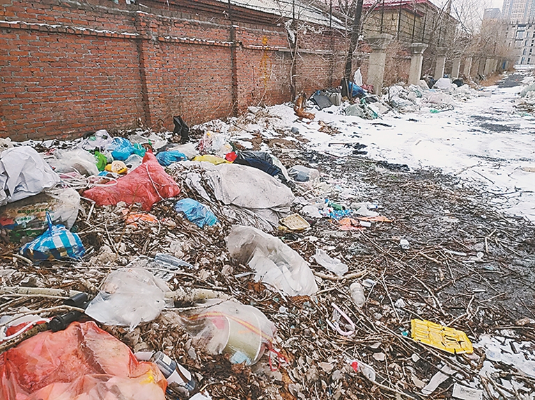 生活报讯 (帮办记者李威兵文/摄) 15日,有冰城市民向生活报帮办记者反映,南岗区尚熙雅轩小区北门门口垃圾随意堆放,无人清雪,非常影响周边环境。