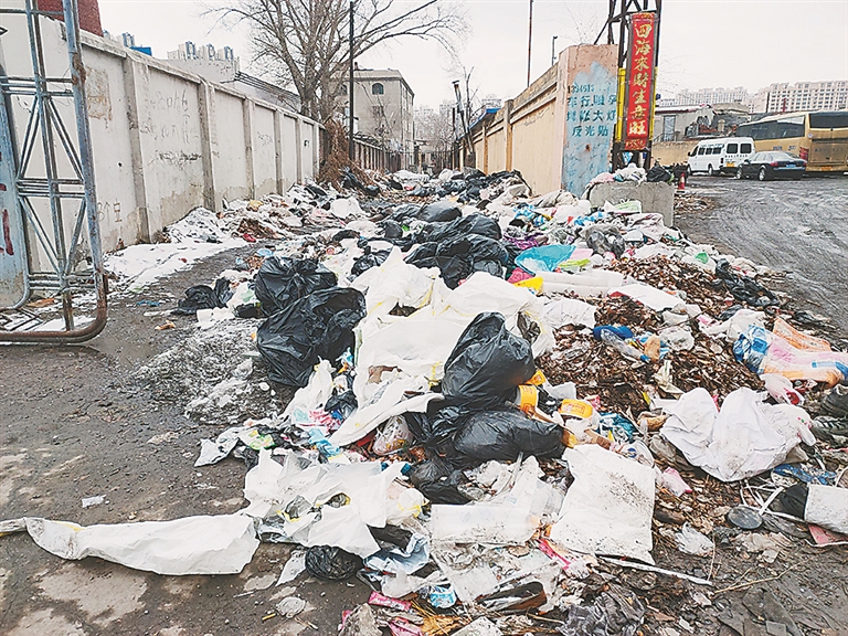 15日,记者来到城乡路439号看到,该小区在城乡路北侧,要从一条无名小路进入,位置比较偏僻。小路的尽头是一个停车场,出口位于居民楼大门前,堆着一大堆垃圾。走近看到,停车场出口旁边有一条小路,几乎都被垃圾堆满了。大大小小的装着生活垃圾的塑料袋被随意丢弃在这里,长达十几米的路面全被堆满了垃圾。住在该楼的王女士说:“我们这个楼是农机家属楼,平时也没看到物业来管过,门口也不知道应该归谁管,反正就是总有人往这儿扔垃圾,还没人清,这都堆了一冬天,现在快变垃圾场了。”