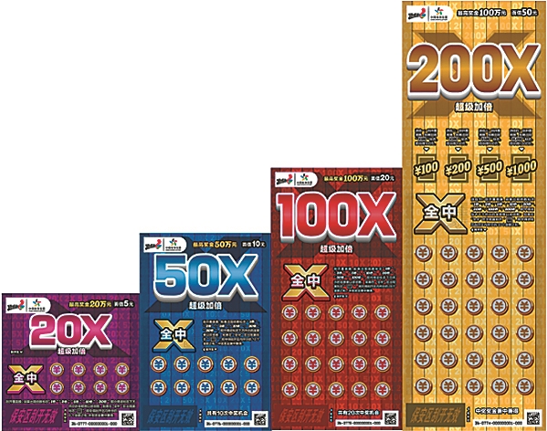 面值5元、10元、20元玩法简单明了,头奖分别为20万、50万、100万。面值5元游戏规则为刮开覆盖膜,如果出现倍数标志“1倍”“2倍”“5倍”“10倍”“20倍”,即中得该标志下方所示的金额乘以该倍数。如果在“全中”区出现赢标志“赢”,即中得刮开区内所示的8个金额之和,中奖奖金兼中兼得。