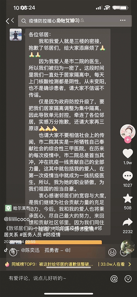 疫情发生后,哈市第二医院的李可欣和丈夫作为“一密”被转运走,所在的单元楼被封控管理,他俩感觉给邻居带来了麻烦,于是临行前在小区业主群里发布了一封致歉信。