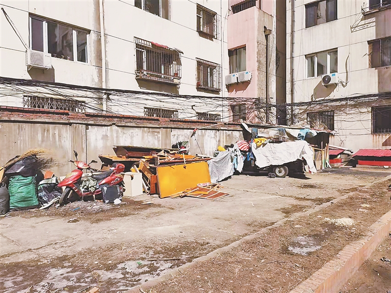 根据居民反映的情况,18日上午,记者来到辽阳街15号院看到,院内一处没有花草的花坛隔出了一块空地,上面堆放了很多杂物。该院三、四单元之间的健身器材旁边,堆放了很大一堆建筑垃圾,三单元3楼的一户居民家正在装修。