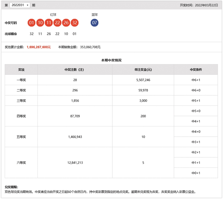 3月22日晚,中国福利彩票双色球游戏第2022031期开奖。当期双色球红球号码为01、10、11、22、26、32,蓝球号码为07。