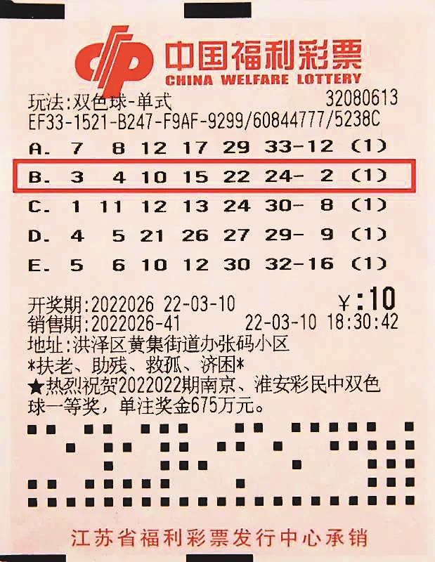 3月10日晚,中国福利彩票双色球游戏第2022026期开奖,当期中奖号码红球为03、04、10、15、22、24,蓝球为02,全国一等奖中出10注,单注奖金为751万元,其中1注花落江苏省淮安市。淮安幸运彩民小孙采用机选5注的投注方式,花10元购买了一张双色球彩票,其中第2注号码与当期的开奖号码完全一致,中得奖金751万多元。