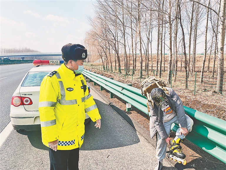 经了解,该男子今年22岁,老家在贵州省赫章县农村,这几年一直在哈尔滨打工。由于近期工作单位效益不好倒闭,没有找到新的工作,现在想回老家,就带了饼干和水,打算滑轮滑回贵州老家,没想到刚上高速就被发现了。