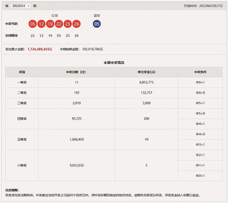 3月27日晚,中国福利彩票双色球游戏进行第2022033期开奖。当期双色球红球号码为05、12、19、22、25、26,蓝球号码为05。