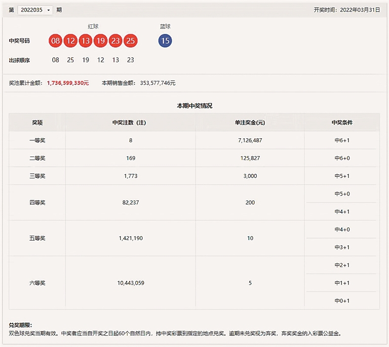 3月31日晚,中国福利彩票双色球游戏进行第2022035期开奖。当期双色球红球号码为08、12、13、19、23、25,蓝球号码为15。