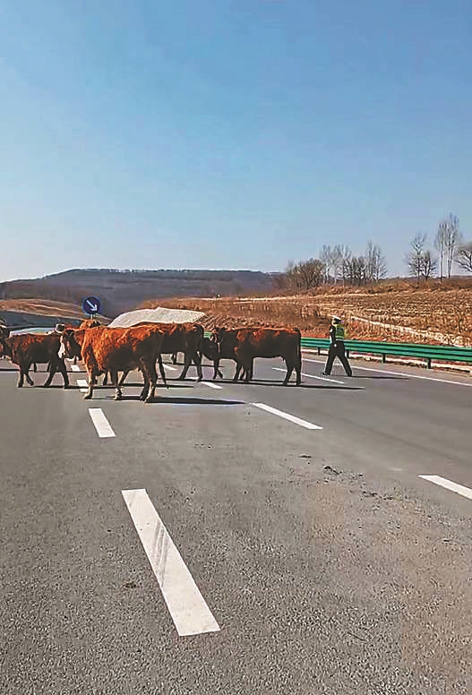 生活报记者了解到,4月4日9时许,民警巡逻时发现行车道上有一大队牛在缓慢行走,细数足足有十五六头,路过车辆纷纷减速避让,情况十分危险。民警当即靠边停车,一人在后方警戒,提醒过往车辆,另一人将它们集中起来,并徒步两公里将牛群成功“护送”出高速公路。
