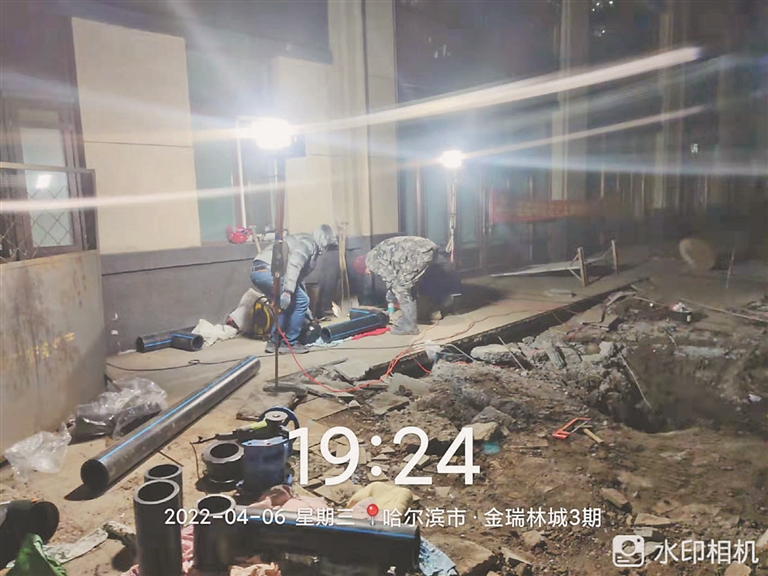 当日,记者联系了哈市自来水公司,工作人员介绍,1日,自来水公司接到金瑞林城小区停水的消息后,立即赶往现场了解情况。目前该小区3期共有6栋高层停水,从1日至6日,自来水公司两个维修队伍都在小区内检查管线,由于该小区物业没有小区内自来水管线相关图纸,无法确定相关管线位置,检查工作无法顺利进行。初步确定停水是由于主管线存在漏点,但漏点位置无法确定,无法立即着手维修。6日,小区物业提供了一张图纸,目前自来水公司工作人员正在根据该图纸对管线进行检测,如果发现漏点,就能立即进行修理。自来水公司工作人员表示,已经对该小区提供了最大的人员力量,尽最大努力保障居民供水问题。