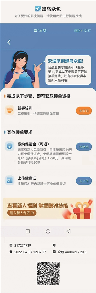 新骑手不用健康证也能接单?记者通过蜂鸟众包APP后台人工客服进行了咨询。客服表示,新骑手可以在21天内提交健康证。如果在21天内跑单总共不超过20单也不需要办理,如果超过了20单,则需提交健康证。