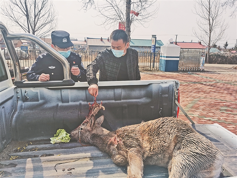 据珍宝岛边境派出所教导员杨秋介绍,“接到村民的求助电话后,我们马上赶到现场,发现一只公狍子误入到村民家中的菜园子里,被铁丝网围住出不去了,狍子还不断在菜园子里飞奔,用力往铁丝网上撞,狍子角都撞出了血,身上也多处受伤。为了对受伤的狍子进行救助,我们与村民先把狍子控制住,然后请来医护人员对狍子的伤口进行了处理,并通过虎林市林草局的工作人员将受伤的狍子送往东方红野生动物救护站进行救治。”