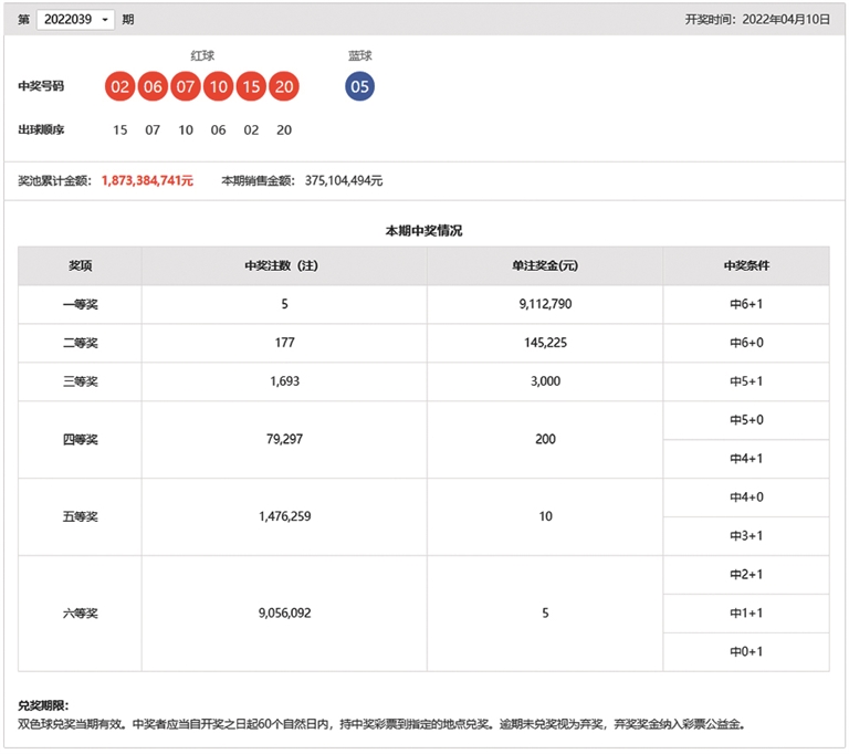 10日晚,中国福利彩票双色球游戏进行第2022039期开奖。当期双色球红球号码为02、06、07、10、15、20,蓝球号码为05。
