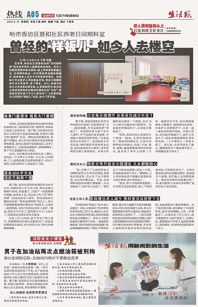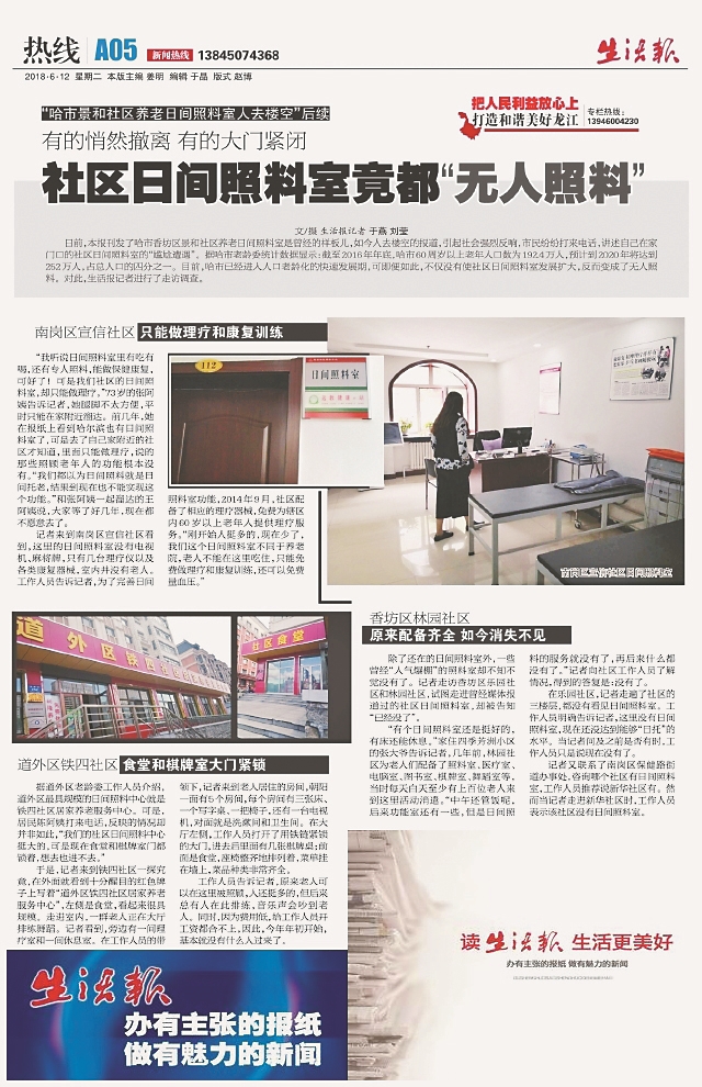 “老了,我们该怎样养老?”“养老的新政策不断推出,但让居民看得见、摸得到的还是少。”……近几年,生活报也持续关注养老这一百姓身边事儿,曾报道过哈市社区养老“样板儿”人去楼空、养老日间照料室无法正常使用、社区老年活动室关闭等多篇稿件,反映社区养老的窘境,积极助力冰城养老政策落地。