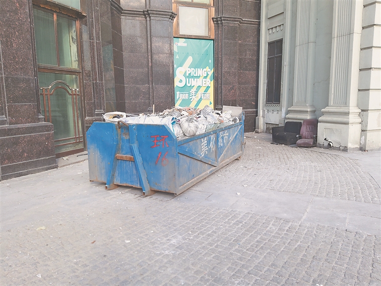 不过,在金太阳一侧的广场地面上,建筑垃圾以及折断的泡沫广告牌不时可见,一个喷着“美化城市”的蓝色大垃圾箱摆放在广场一角;临街花坛中有烟头纸屑以及一次性塑料杯等杂物。