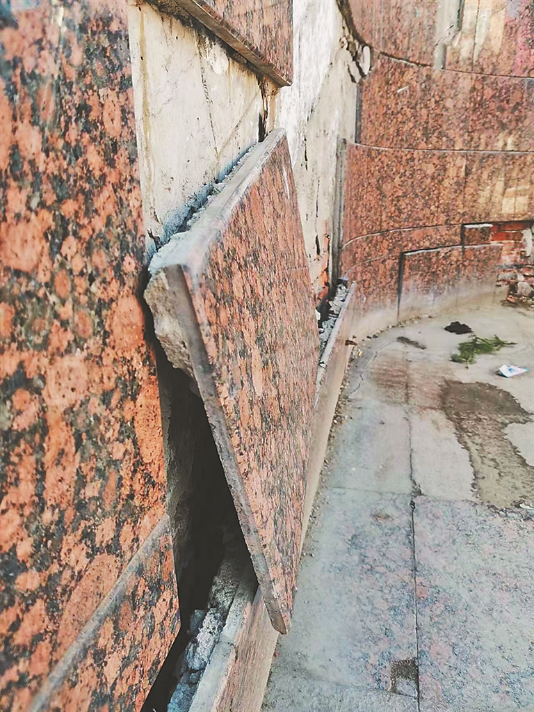 但是这里的台阶和围墙破损比较严重。记者在延福街正门前看到,进入空中广场的台阶破损严重,尤其第一级和第五级台阶。上了五级台阶后,有个半圆的舞台,舞台四周的墙面绝大部分已破损,瓷砖脱落。