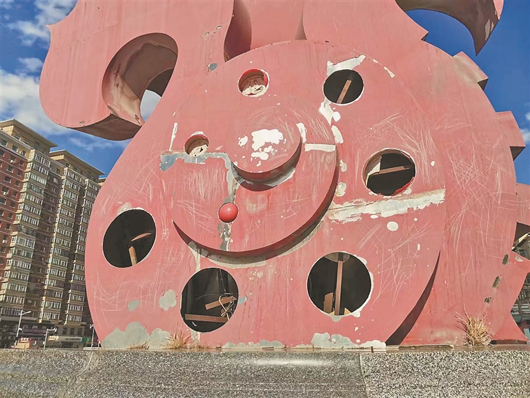 记者在红旗大街和延福街交口的安埠广场看到,四周是整齐的花坛,广场中间矗立着一个约8米高的雕塑,走近一看,发现雕塑表面有多处油漆脱落。在下端有个齿轮状的装饰,四周有七个盘子大小的窟窿,透过窟窿能清晰地看到雕塑里面的钢结构。附近居民告诉记者,雕塑刚建成时,这几个窟窿装的是彩灯,晚上非常漂亮,后来灯坏了,壳也掉了,成了现在这个样子,很不美观。