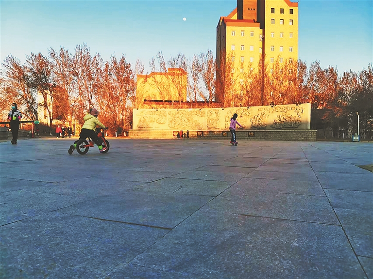 记者来到日月广场看到,这是一个高出地面两三米的空中广场,目测面积超1万平方米。这里的卫生绿化挺好,绿地里的小草已返青,广场上栽植着低矮的小树。孩子们在快乐地玩耍。