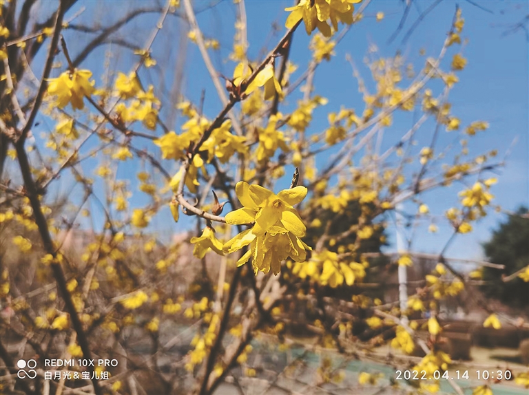 生活报讯 (记者李丹文/摄) 14日,在道外区古梨园,东北连翘在春风的吹拂下显得格外艳丽。它是哈市城区街路和公园里最先绽放的春花之一,它的绽放标志着冰城街路和公园里最美的春花季即将全面启幕。