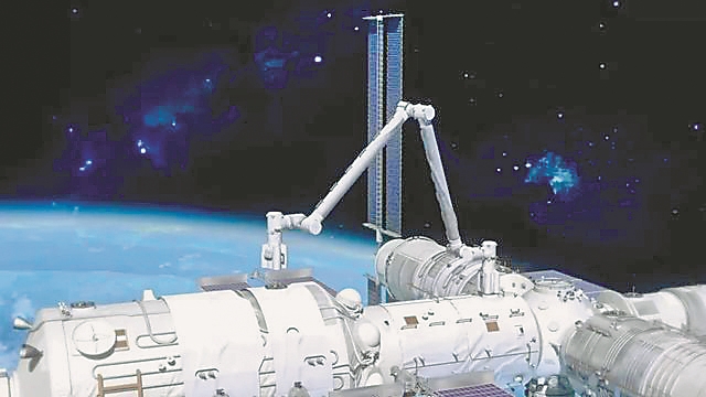 本次安装任务的机械臂悬挂装置和部分转接件,由哈工大和中科院长光所联合研制机械臂转接件,能把长度10米的核心舱机械臂同长度5米的实验舱机械臂组合起来。实现双臂间电气和信息的互联互通,机械臂悬挂装置带有巧妙的抱爪结构,能够根据指令自动捕获、锁紧或释放转接件,为转接件舱外长期驻留提供保障。