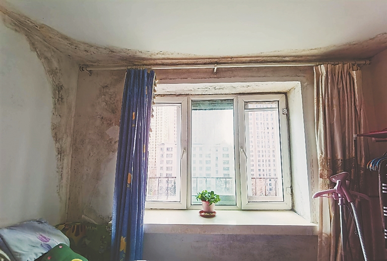 生活报讯 (帮办记者肖劲彪文/摄)日前,家住哈市南岗区盛世桃园小区6栋701室的李女士向帮办记者反映,她家室内墙体渗水发霉,影响正常的生活。