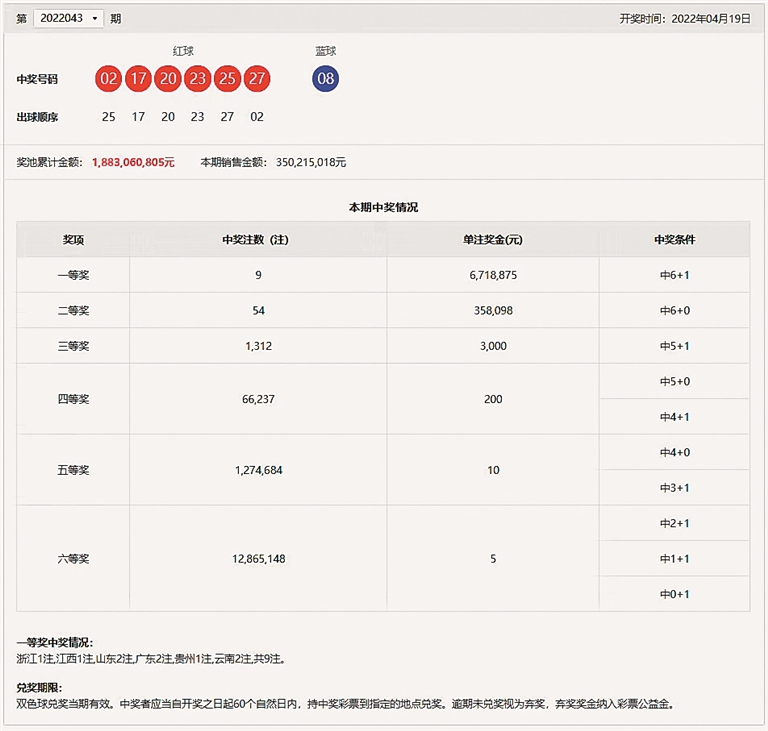 4月19日晚,中国福利彩票双色球游戏进行第2022043期开奖。当期双色球红球号码为02、17、20、23、25、27,蓝球号码为08。