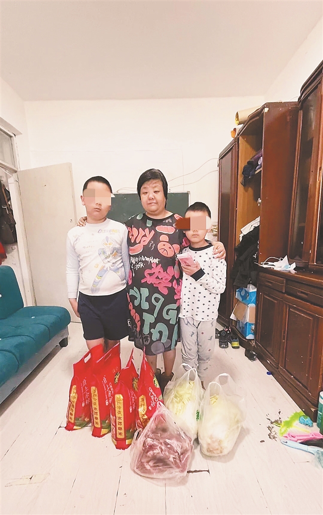 放下电话后,田桂玲立即联系副队长王义祥,商量着由王义祥和管理员王海燕,启用团队助学爱心捐助基金去购买慰问品,并召集队员为孩子进行月捐。第二天早上,王义祥和王海燕来到超市采购,“我们买了几袋大米,7斤猪肉,大白菜等,然后开车送到小哥俩家。”王海燕说,“当时孩子们和妈妈正要下楼做核酸,看见我们送来的粮食和蔬菜,马上眼眶就湿了。”
